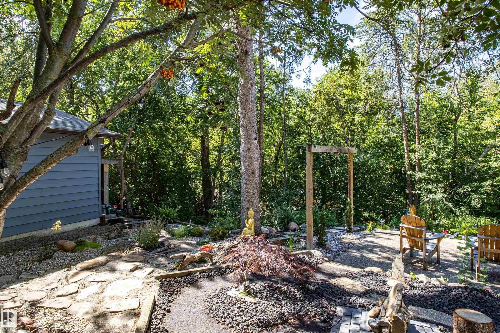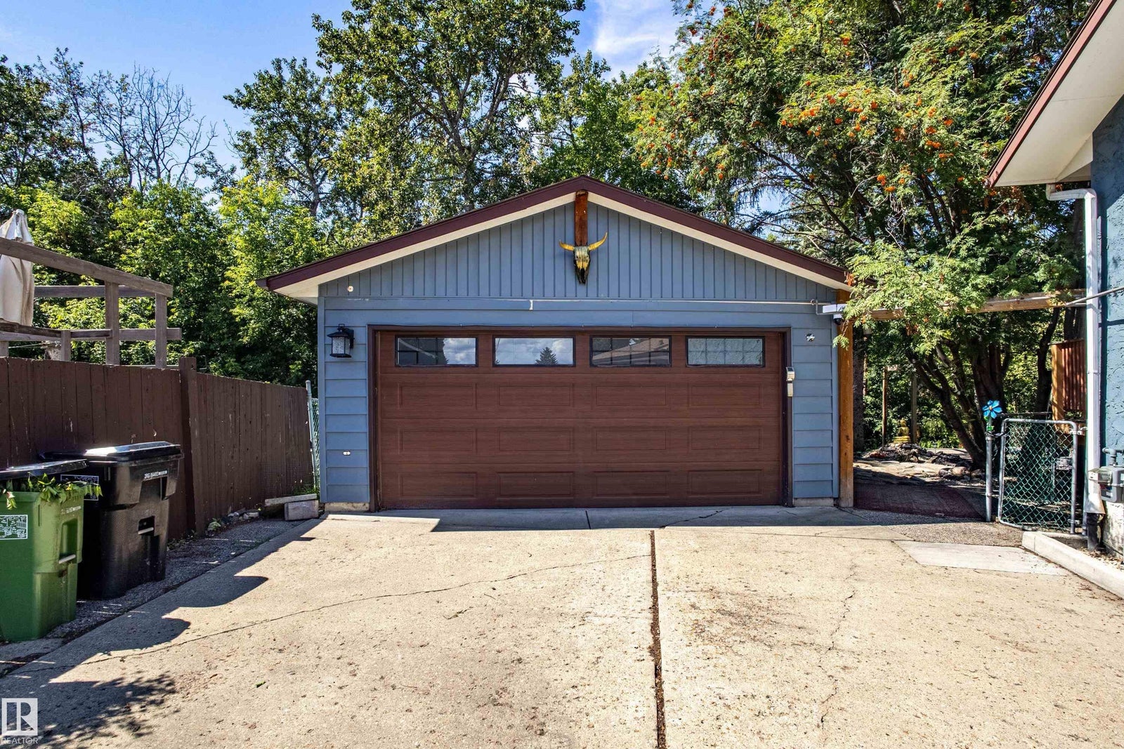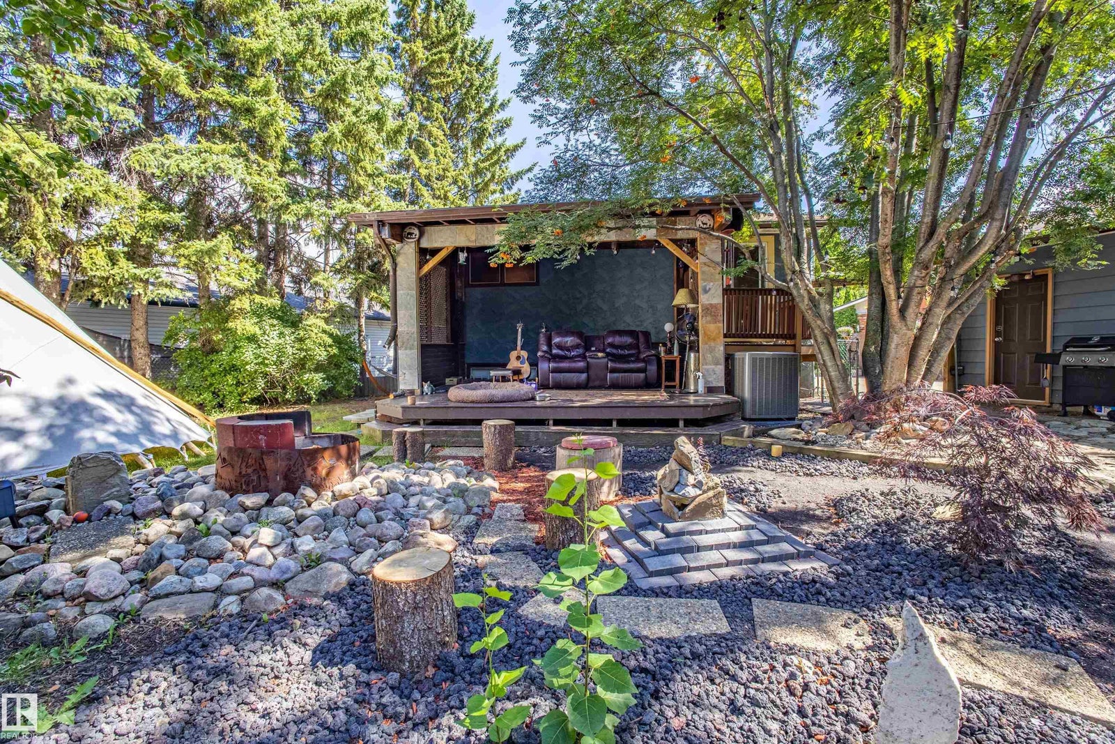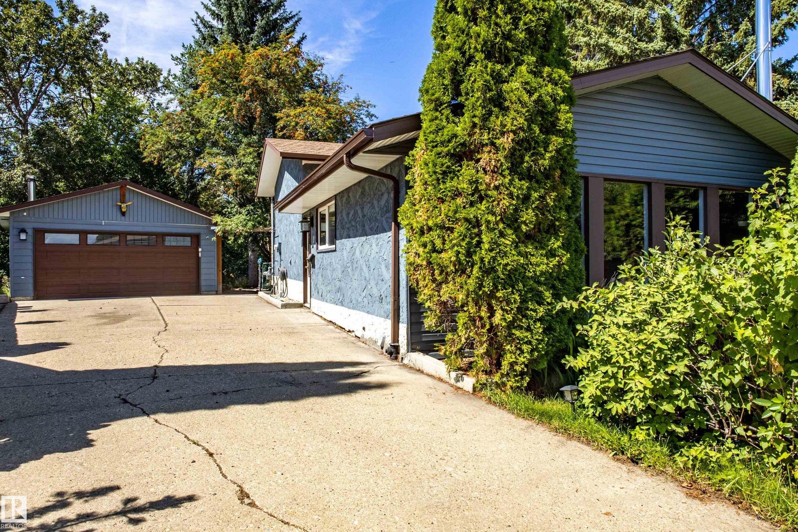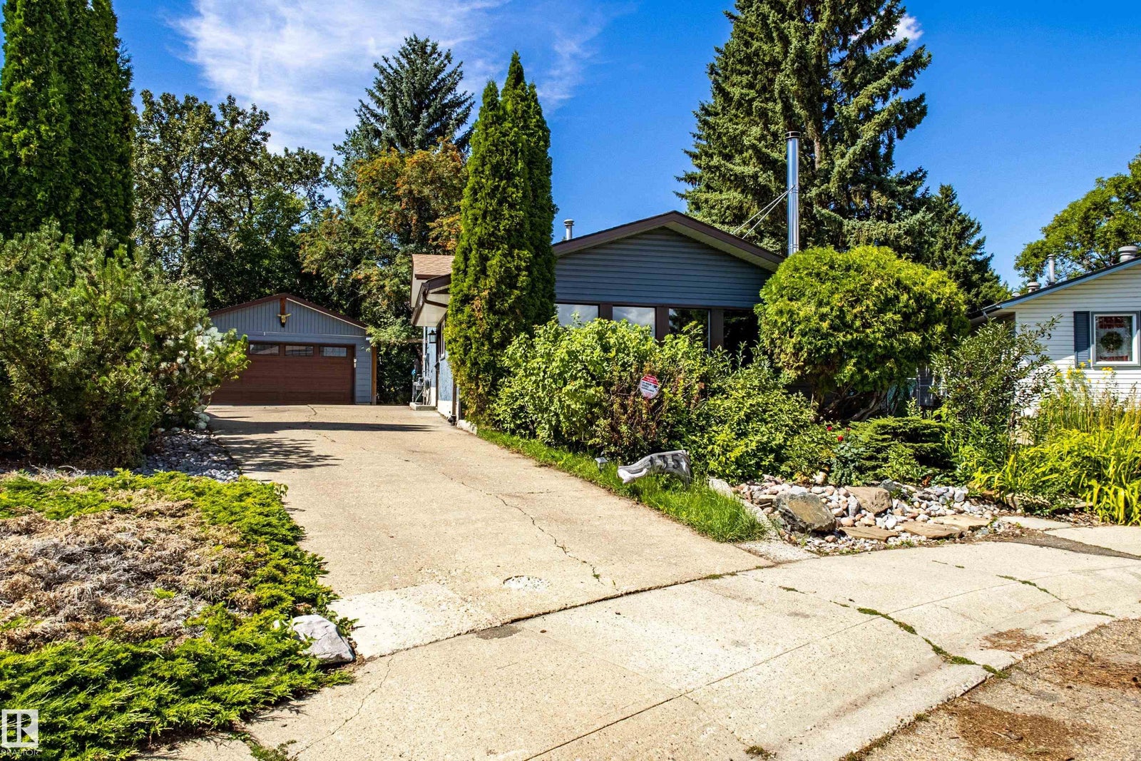 LARGE PIE LOT, WITH PRIVATE YARD BACKING ONTO RAVINE! Located on a quiet crescent location with mature trees and tons of privacy, great for entertaining or enjoying nature! FULLY FINISHED 3-level split, with hardwood flooring upstairs, wood burning fireplace, plenty of windows and light! Upstairs you will find two bedrooms and master bedroom with access to deck, and access to 4 pc main bath. Main floor features large living room, bright kitchen and dining area! Third level of this 3 level split offers laundry room and 3 pc bath as well as a large family room that would be a great kids playroom, gym or additional bedroom. Heated double detached garage is 22x20. Everyday convenience, too: walk to nearby schools, shopping, and amenities, with quick access to Yellowhead Trail and Anthony Henday for easy citywide commuting.
