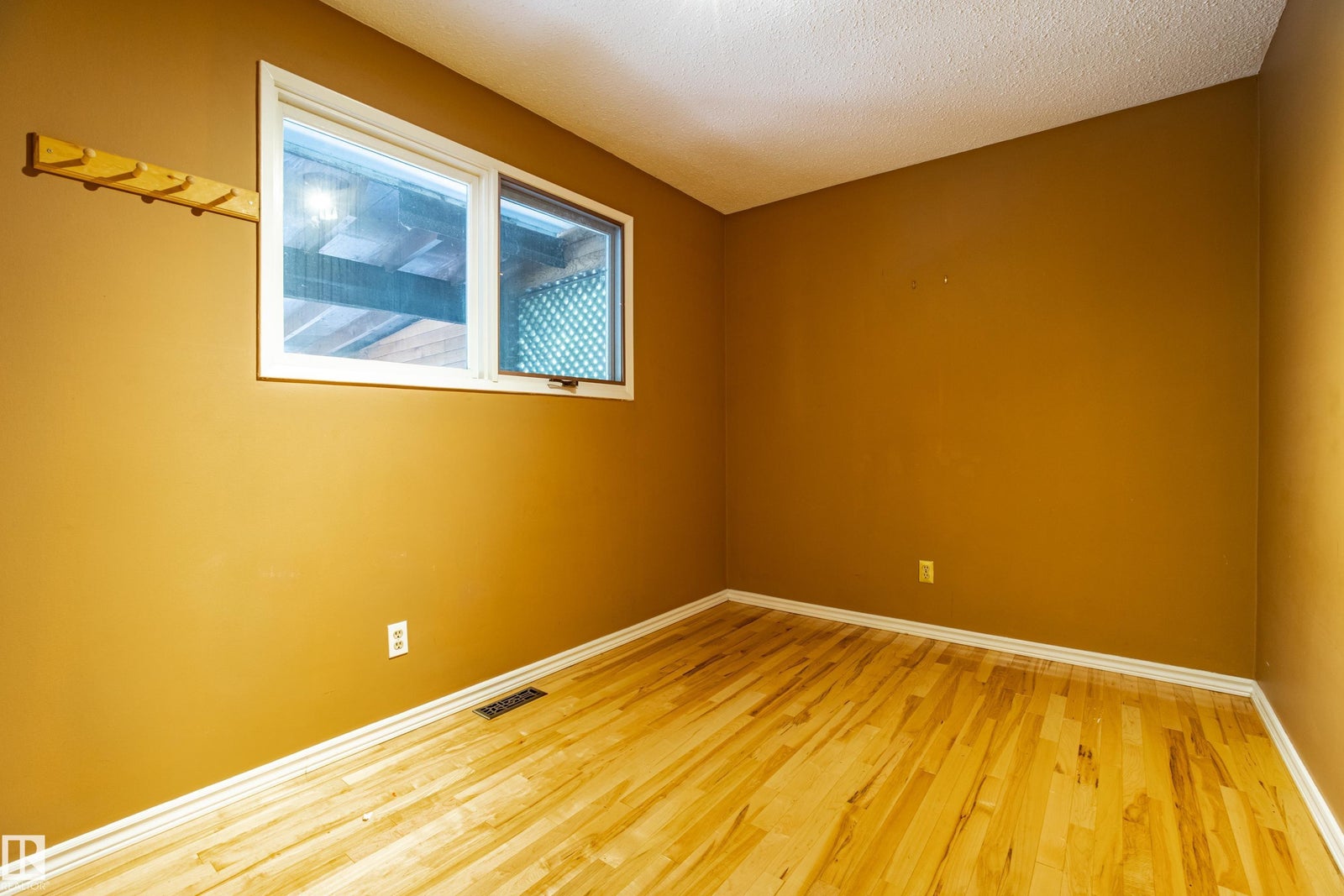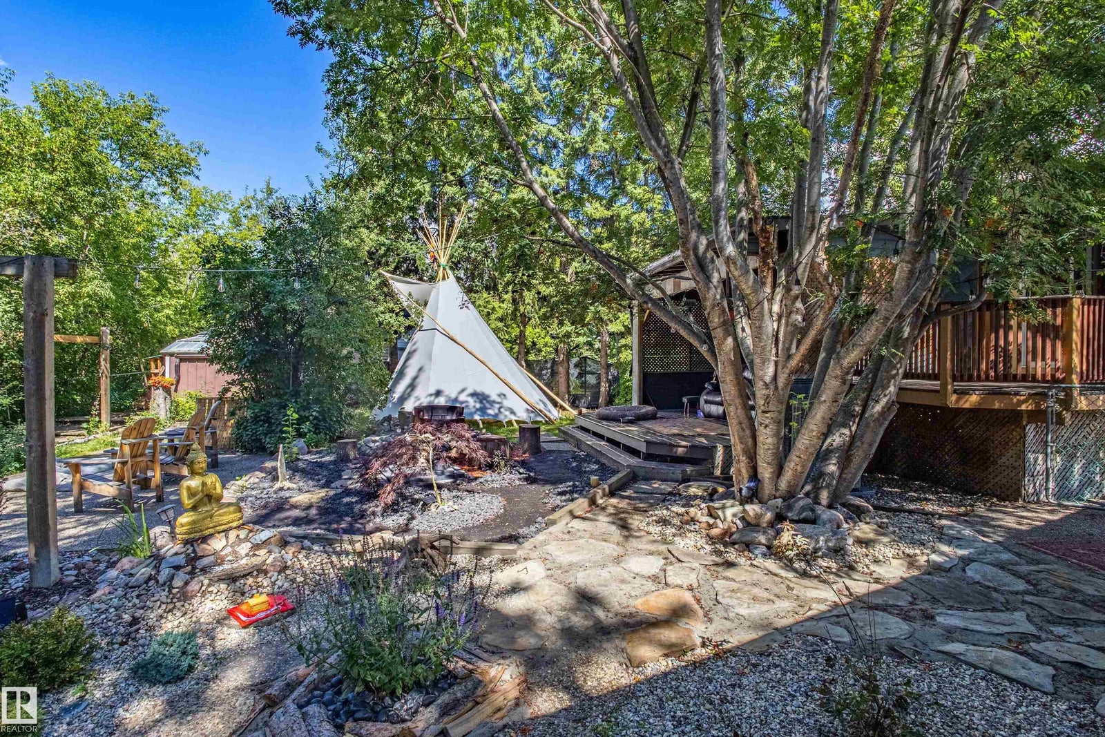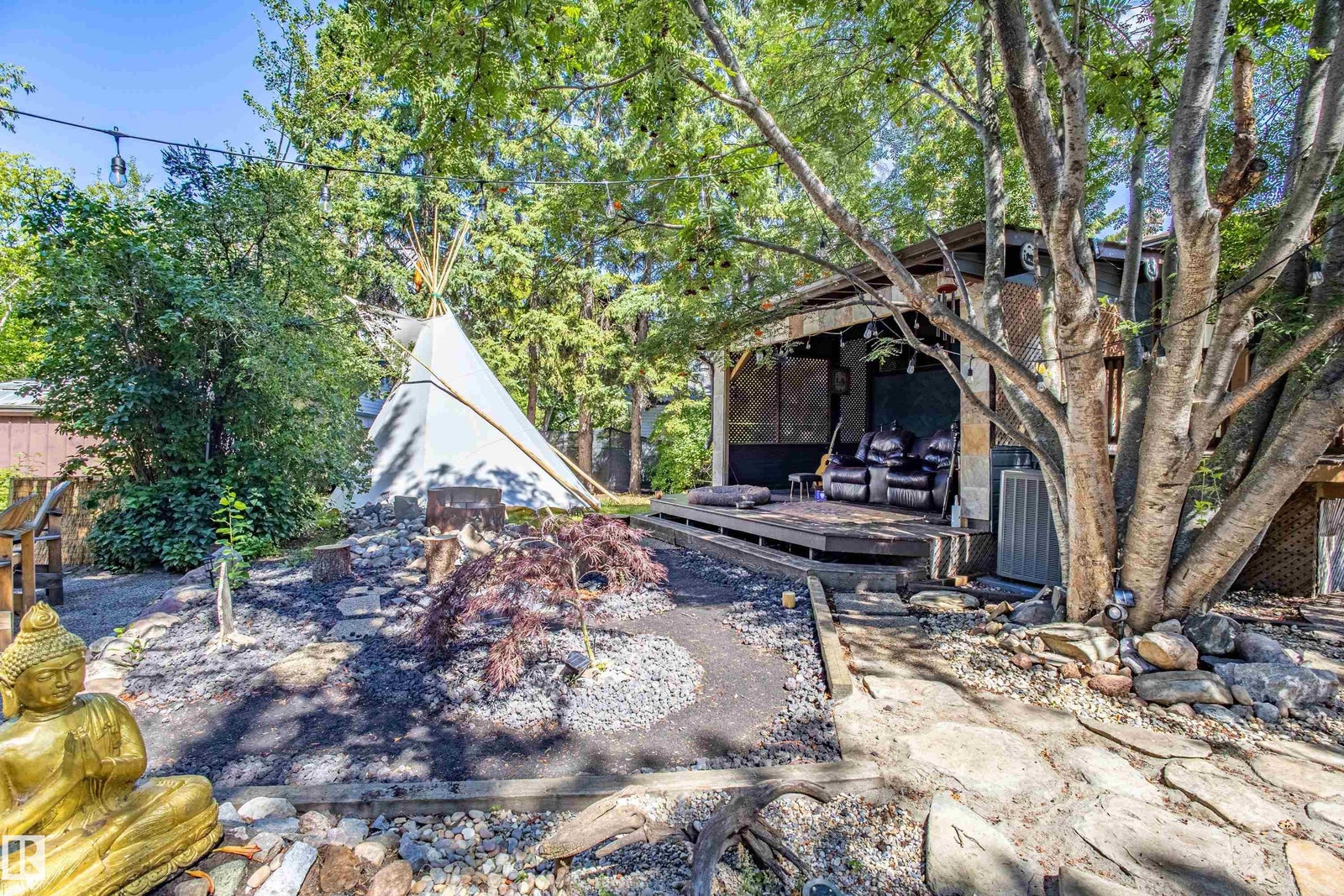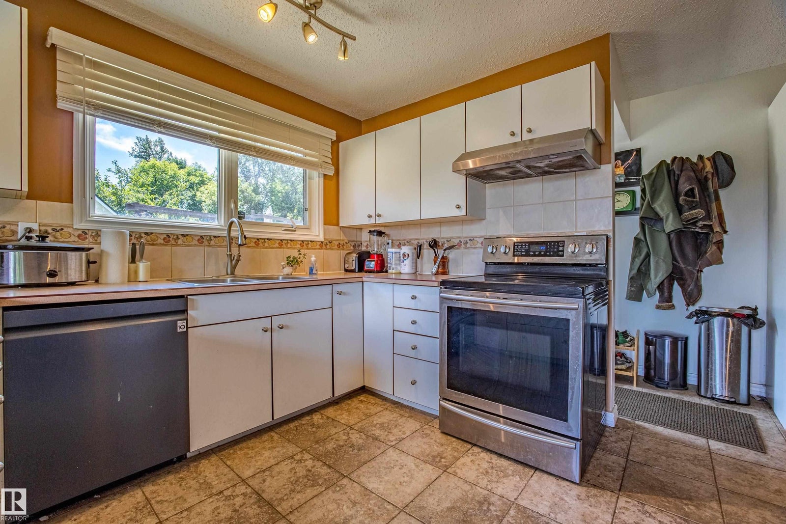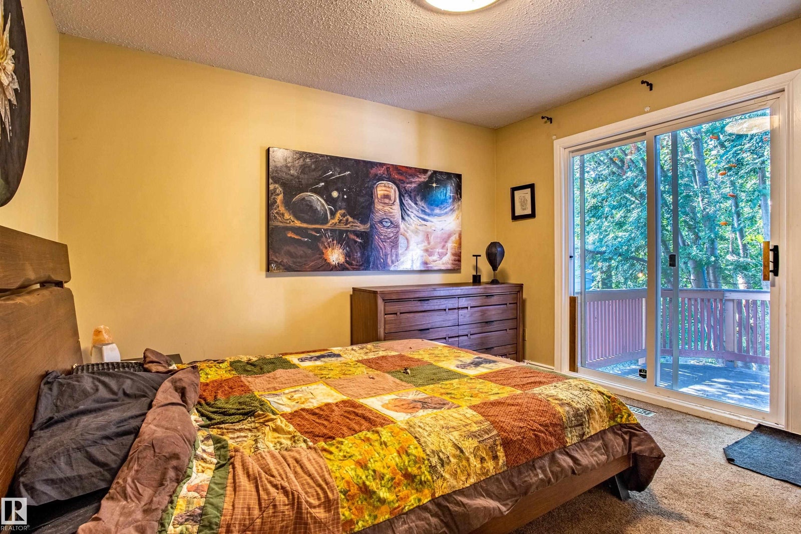 LARGE PIE LOT, WITH PRIVATE YARD BACKING ONTO RAVINE! Located on a quiet crescent location with mature trees and tons of privacy, great for entertaining or enjoying nature! FULLY FINISHED 3-level split, with hardwood flooring upstairs, wood burning fireplace, plenty of windows and light! Upstairs you will find two bedrooms and master bedroom with access to deck, and access to 4 pc main bath. Main floor features large living room, bright kitchen and dining area! Third level of this 3 level split offers laundry room and 3 pc bath as well as a large family room that would be a great kids playroom, gym or additional bedroom. Heated double detached garage is 22x20. Everyday convenience, too: walk to nearby schools, shopping, and amenities, with quick access to Yellowhead Trail and Anthony Henday for easy citywide commuting.